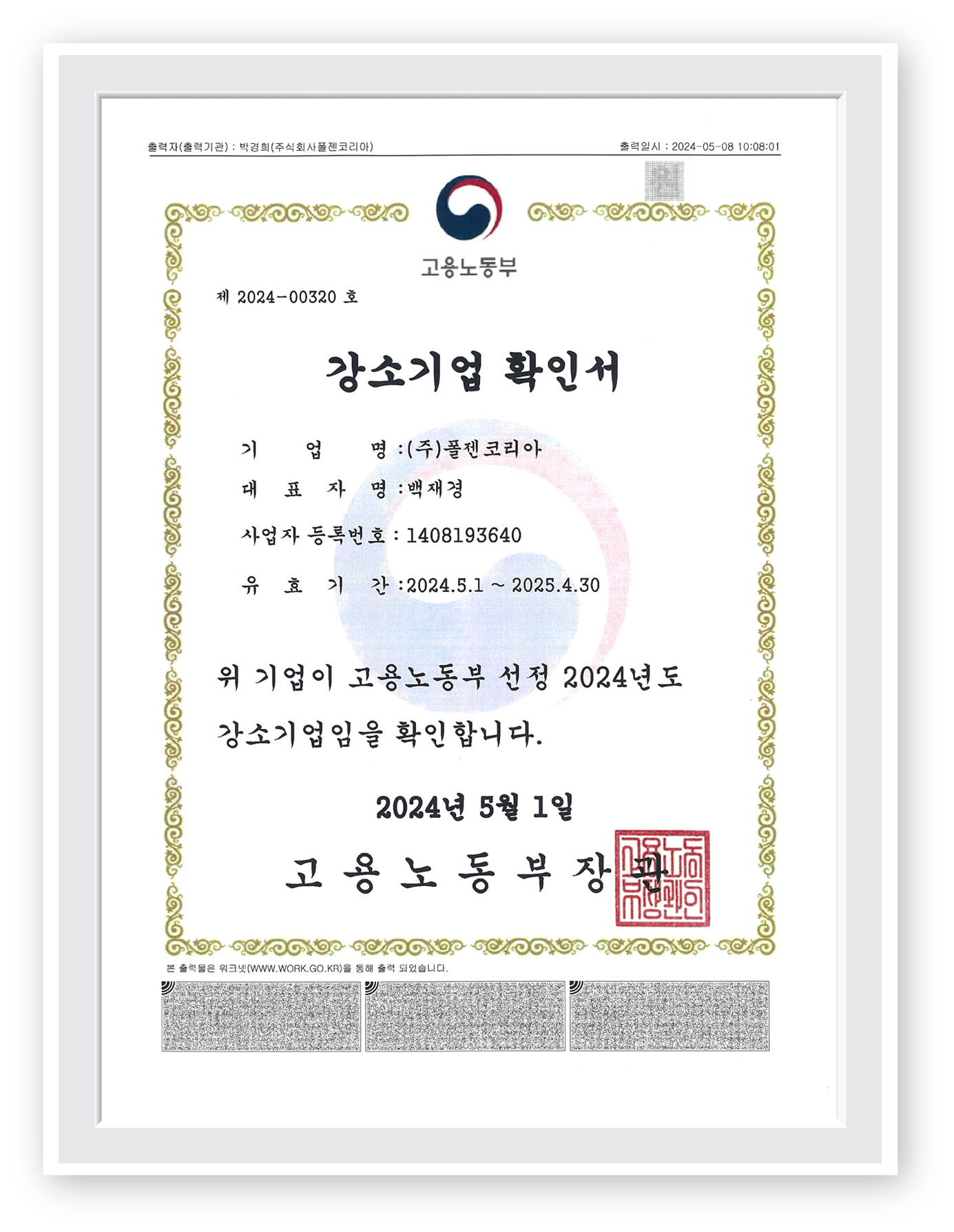 Folzen Korea has been selected as a 'strong and small enterprise' by the Ministry of Employment and Labor in 2024.