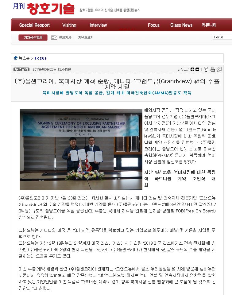 The article on Folzen Korea, the North American market exploration cruise, and the export signing with the Canadian Grand View has been published in the window technology news.
