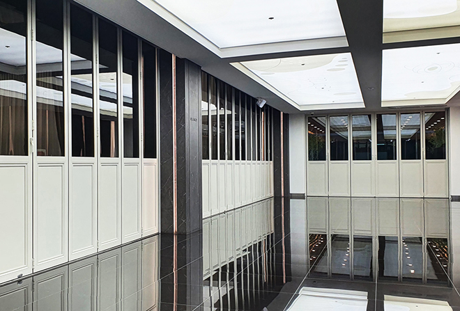 Folding doors with distinctive visual interior effects; wood texture pattern applied to the surface of regular aluminum folding doors; applicable to all types of folding doors; processed with sustainable thermoelectric papers, not regular film papers.