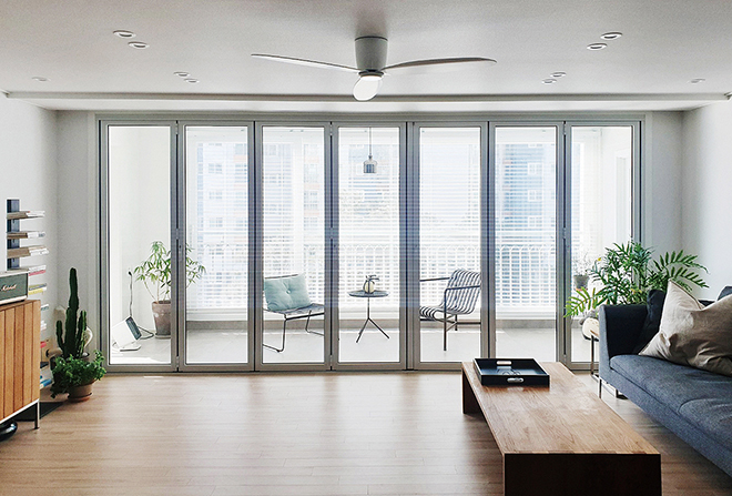 Folding doors suitable for residential facilities; Applicable to areas where the living room and the balcony are extended so that doors cannot be buried on the floor; Convenient to use at home due to a low level of exposure and smooth opening and closing.