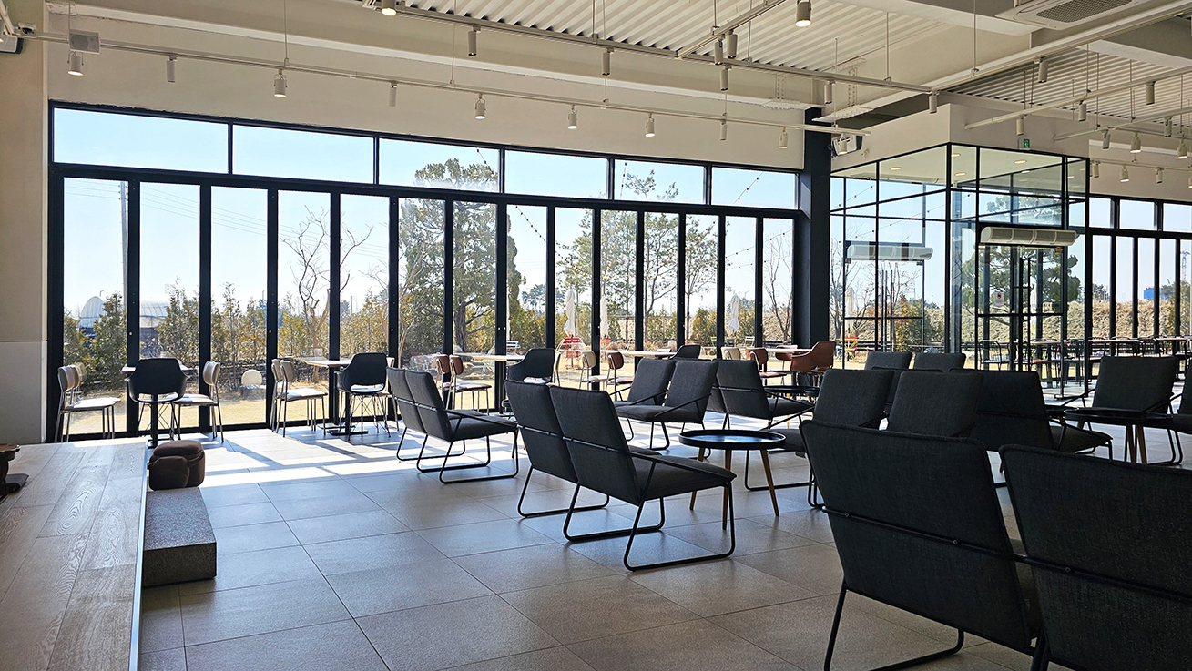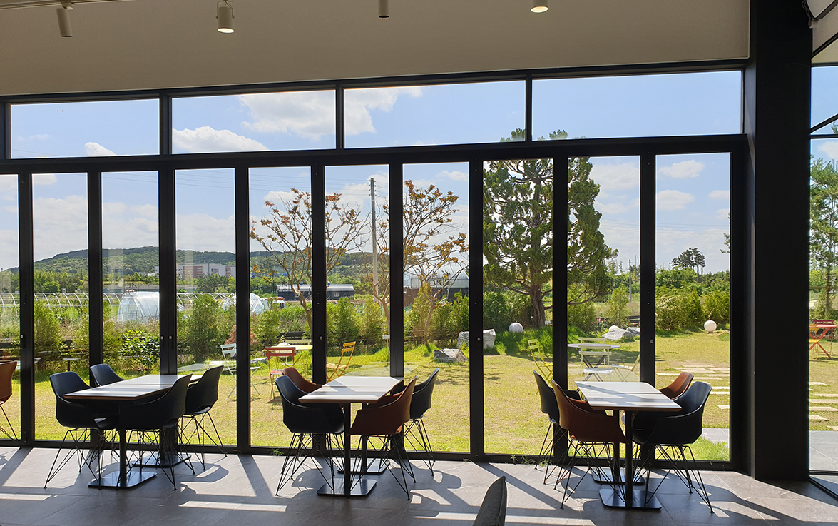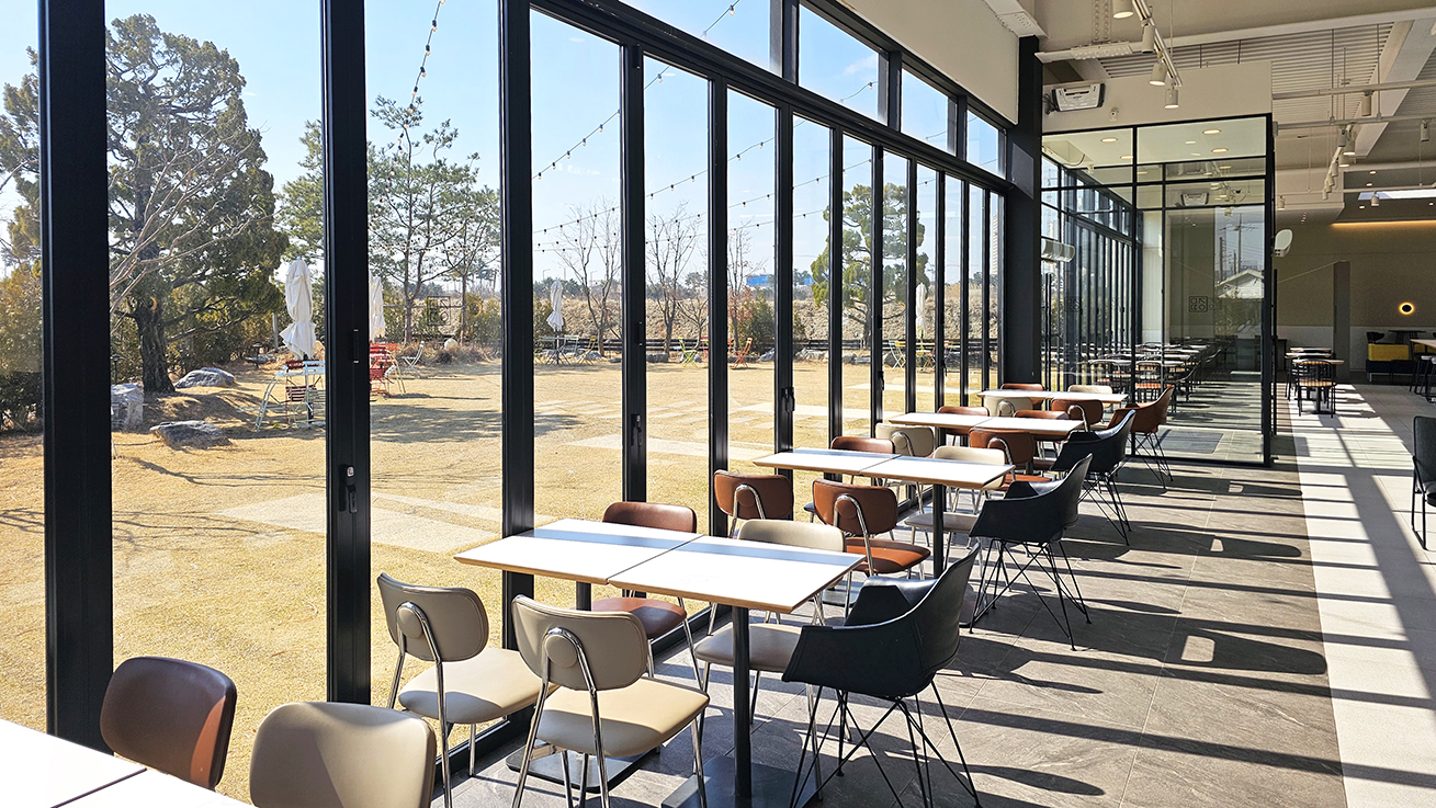 야외 정원이 있어 폴딩도어를 개방하면 자연을 즐기며 공간을 활용할 수 있고, 폴딩도어를 닫아두면 외부 소음과 방해 없이 조용하고 편안한 공간을 제공합니다. 폴딩도어는 공간을 자유롭게 변화시킬 수 있어, 고객들이 필요에 따라 다양한 환경을 경험할 수 있게 해줍니다.