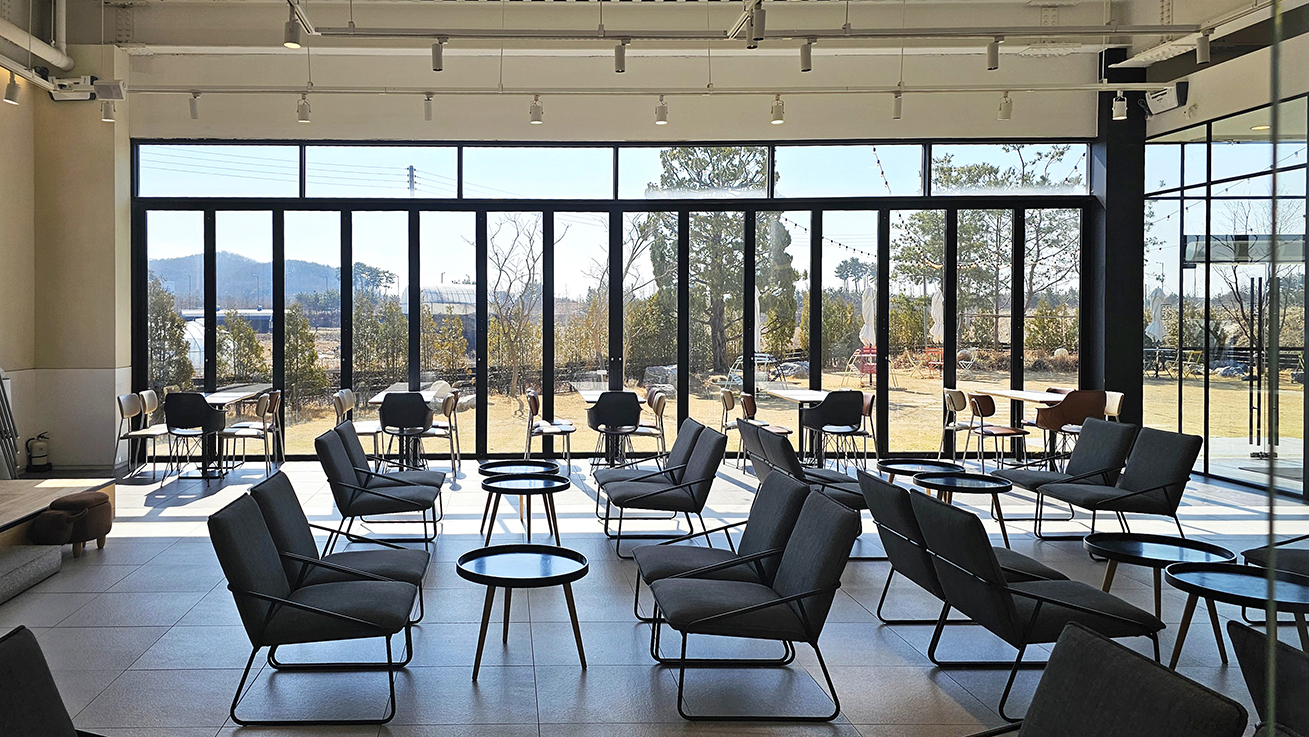 영종도에 위치한 대형 베이커리 카페는 1층 카페와 2층 루프탑이 있는 단독 건물로, 1층의 정원과 연결된 창가에 폴딩도어 24장이 설치되었습니다. 이 카페의 인테리어는 블랙, 그레이, 화이트 톤으로 세련되고 모던한 분위기를 자아내는데, 이에 맞춰 블랙 컬러의 폴딩도어가 설치되어 더욱 세련된 느낌과 함께 무게감도 전달됩니다.