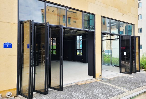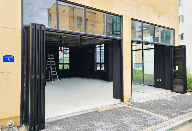 총10장의 폴딩도어를 5장씩 나눠 2곳에 설치하였으며, 좌/우 양방향으로 여닫게 하여 편개형 전개방식이지만 모두 개방하면 양개형 전개방식과 같은 느낌으로 사용이 가능합니다.