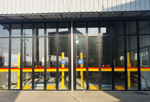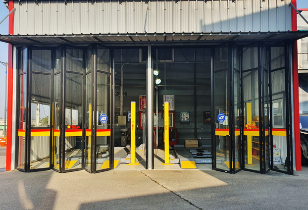 오일과 다양한 오염물들이 많은 카센터 특성에 맞게 블랙 색상의 폴딩도어로 제작을 진행하였으며, 보다 넓은 개폐감을 주기위해 각 프레임 마다 한방향으로 개폐 하는 편개형 전개방식으로 시공을 진행하였습니다. 크기가 큰 차량이 출입해야하는 카센터로 넓은 출입구가 필요한데 그런 이유로 상시 뻥 뚫린 출입구만으로 둔다면 각각 진행되는 작업 소리에 내부 뿐만 아니라 외부까지 시끄러운 소음 소리가 퍼져 인근 주민분들 등에게 피해를 전달 하게 됩니다.