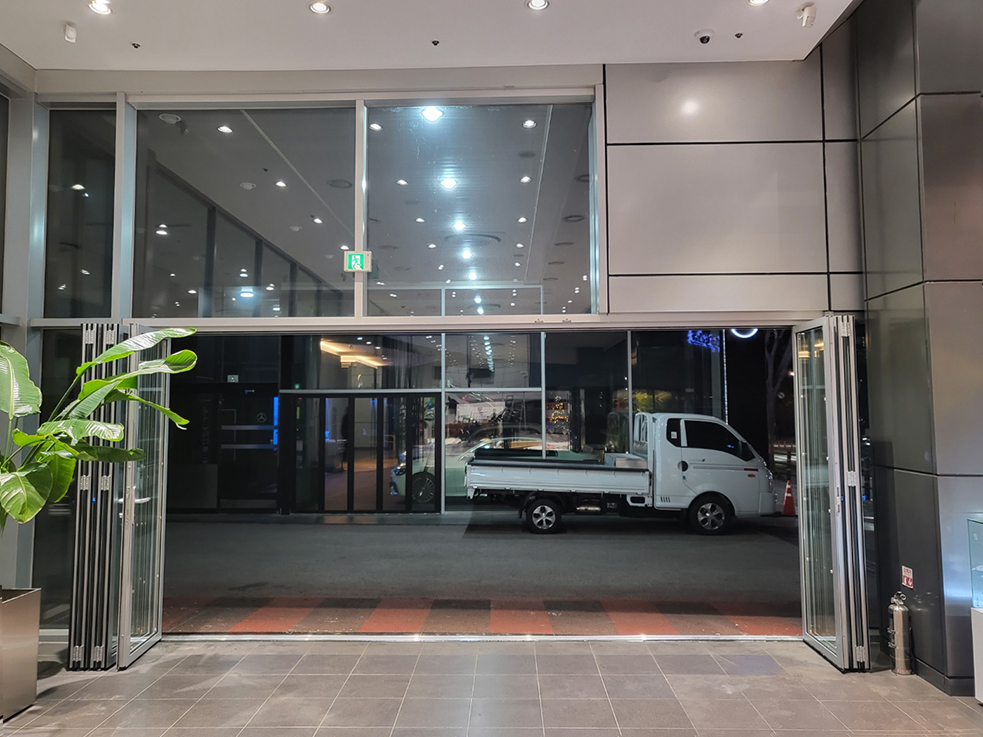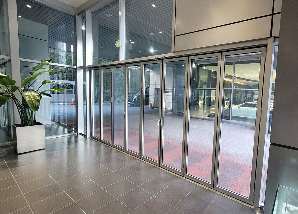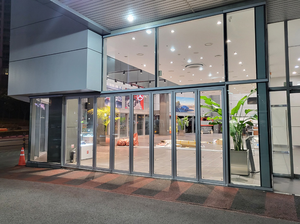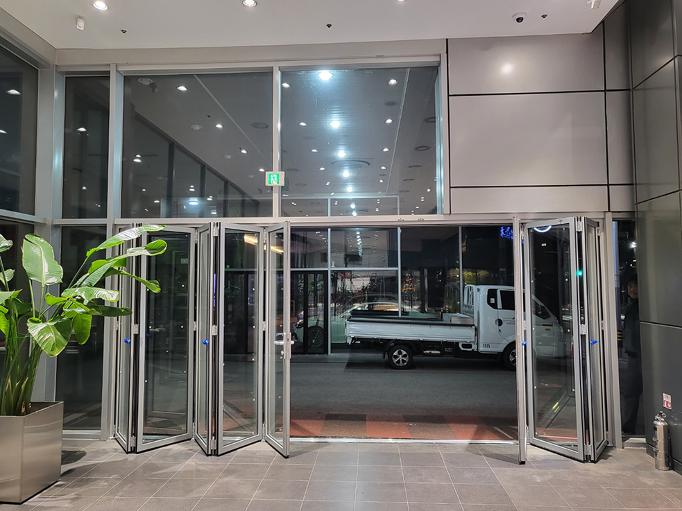 ▷ 부산 해운대 포르쉐 센터 ◁ 부산 해운대에 위치한 포르쉐 센터입니다. 차량 정비센터가 있어 차량이 내부로 진입해야 하기 때문에 카센터용 하부레일을 사용했으며 포르쉐 센터와 잘 어울리는 실버 컬러의 폴딩도어를 설치하여 세련된 포르쉐 매장의 분위기를 업그레이드 하였습니다.