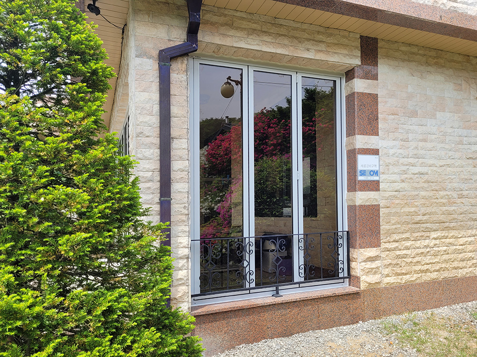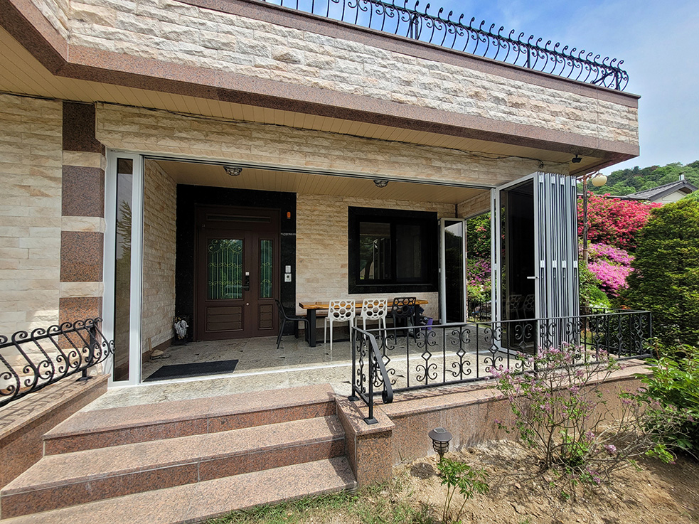 양평 문호리에 위치한 단독주택은 기존에 현관 앞 공간에 도어가 없어 외부인의 출입과 보안 문제, 단열 부족, 바람에 의한 먼지와 벌레 유입 등 여러 불편함이 있었습니다. 이를 해결하기 위해 정면과 측면에 화이트 컬러 폴딩도어를 각각 8장과 3장 설치하였습니다.