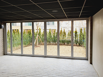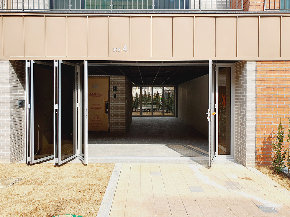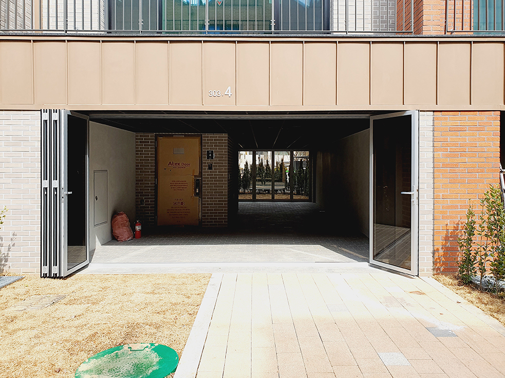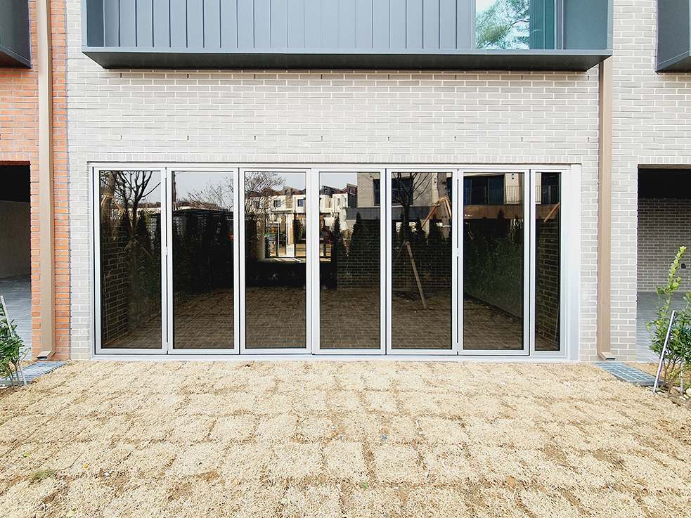 정원 쪽에는 22T 브론즈 유리와 투명 유리가 결합된 블랙컬러 폴딩도어를 8장, 현관 쪽에는 5장을 설치하였는데, 브론즈 유리 덕분에 외부에서 내부가 잘 보이지 않아 프라이버시가 잘 보장됩니다. 또한, 외부인의 출입을 제한하고 물건의 도난 및 분실을 방지할 수 있어 안전성도 강화되었습니다.