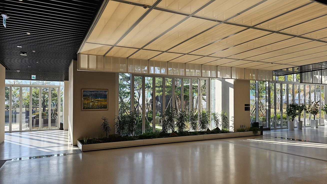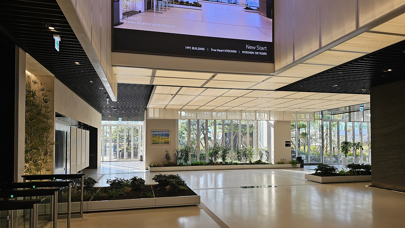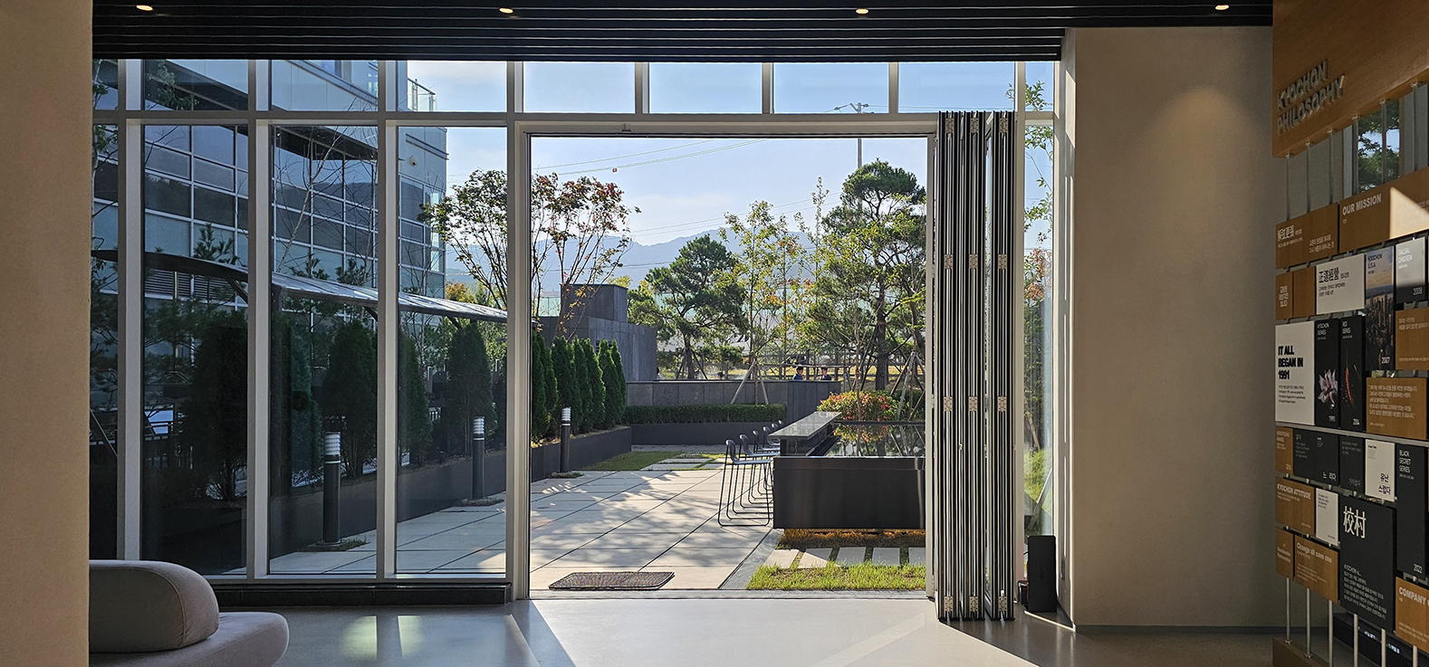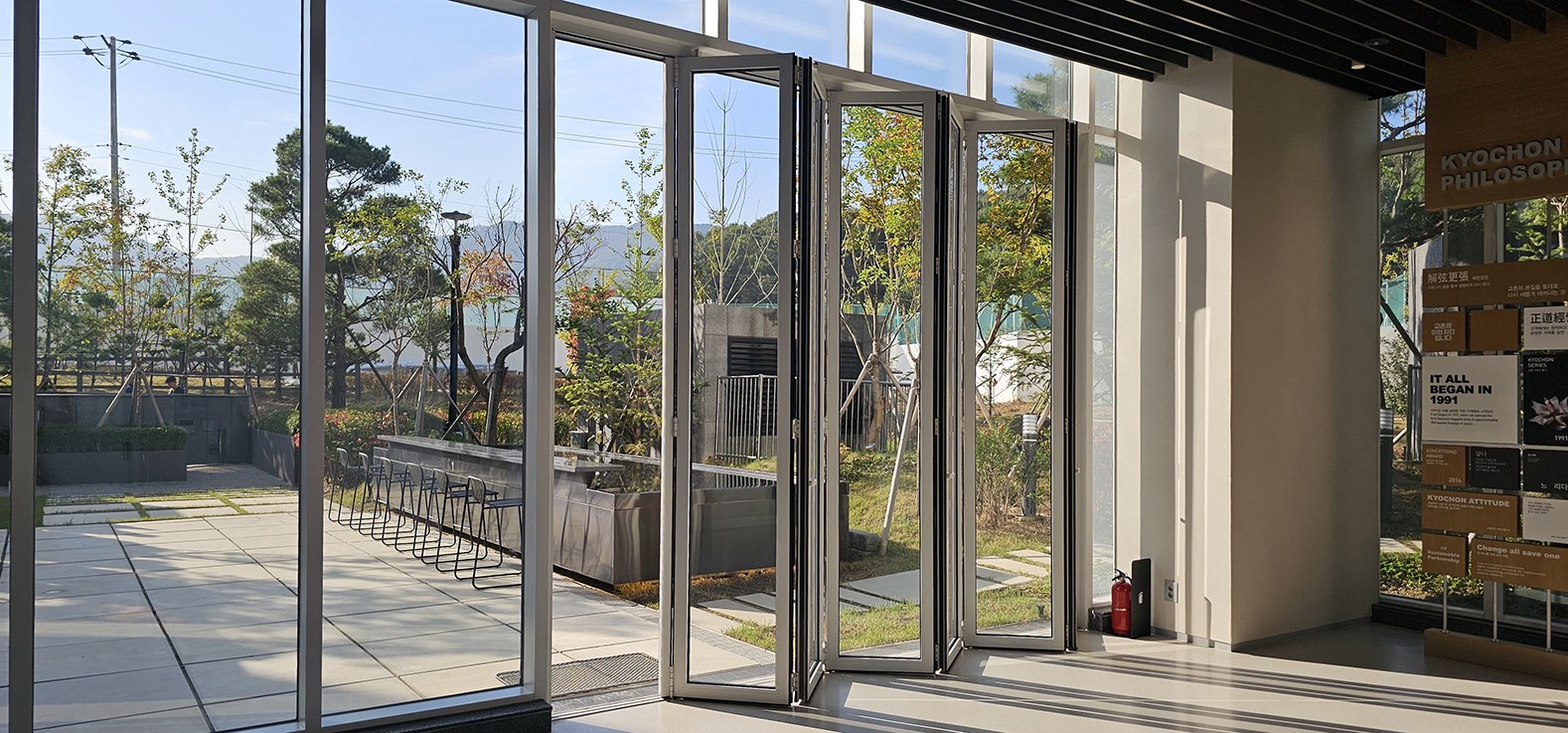 교촌 F&B의 판교 사옥 1층 로비에 설치된 폴젠코리아의 단열폴딩도어는 뛰어난 열효율과 우수한 단열 성능으로 실내 온도를 균일하게 유지시켜줍니다. 내구성과 기밀성이 뛰어나 외부 단창으로 설치해도 전혀 손색이 없으며, 고합금 소재로 제작되어 오랜 기간 사용해도 변형 없이 안전하고 튼튼하게 기능을 유지합니다. 또한, 교촌 F&B와 같은 기업에서는 에너지 효율과 안정성 모두 중요한 요소인데, 폴젠코리아의 단열폴딩도어가 이를 충족시켜 주어 많은 신뢰를 얻고 있습니다.