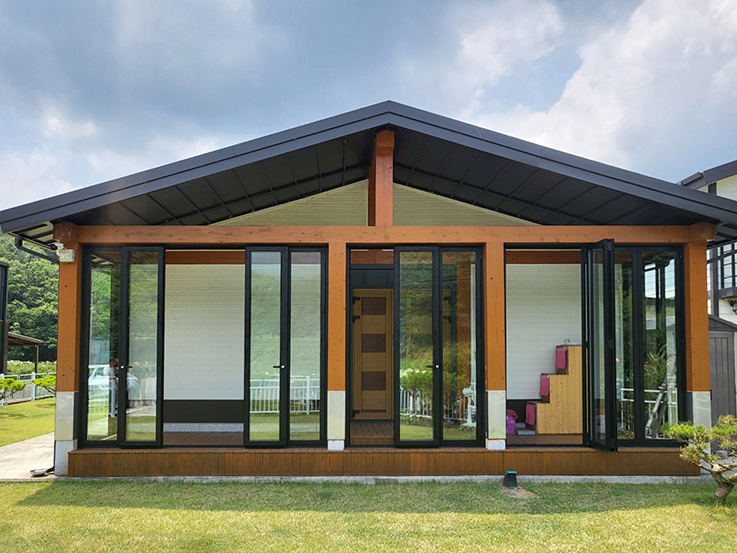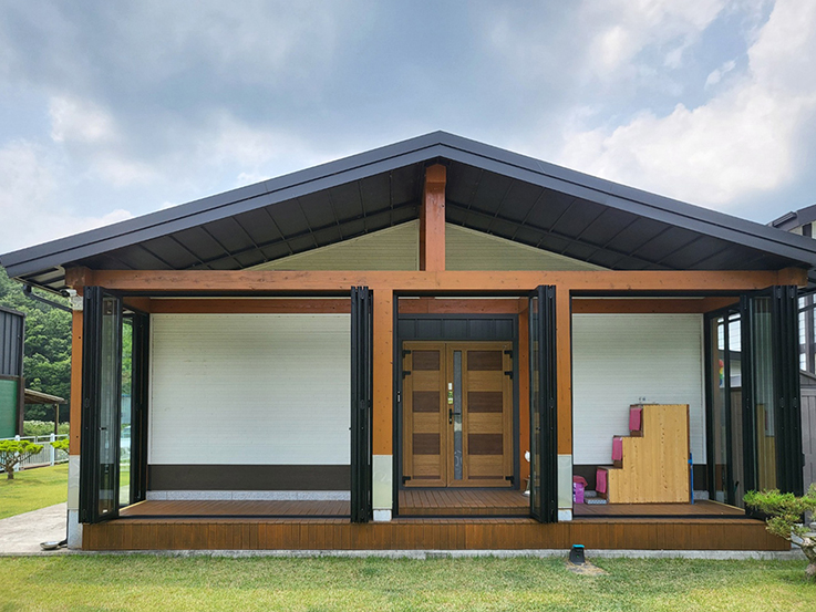 파란 하늘 아래 넓은 마당을 가진 개인 주택에 폴딩도어를 설치한 것은 매우 현명한 선택입니다. 폴딩도어는 개방감이 뛰어나, 문을 열면 외부와 내부 공간이 자연스럽게 이어져 집이 훨씬 넓어 보이는 효과를 줍니다. 또한, 현대적이고 세련된 디자인으로 집의 분위기를 한층 고급스럽게 만들어 줍니다. 폴딩도어는 바람도 잘 통하고 통풍이 원활해져 여름에 시원한 공기를 실내로 끌어들일 수 있어 매우 유용합니다. 넓은 부지를 가진 전원주택에 설치하면 실내 공간을 최대한 활용할 수 있어 만족도가 높습니다. 전원주택의 아늑하고 따뜻한 느낌과 잘 어울리며, 현대적인 요소를 더할 수 있어 집의 장점을 최대한 살리는 데 큰 도움이 됩니다.