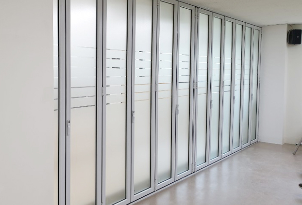 어린 아이들도 손쉽게 사용할수 있도록 양개형 구동방식으로 진행하였고, 공간을 나눠 수업을 진행할 경우 방해되지 않도록 투명 유리에 안개시트지를 이용하여 반투명 효과를 내었습니다. 전체적으로 안개시트지를 부착하면 답답함을 생길수 있기에 일괄적인 선을 포인트로 넣어 답답함을 없애고 인테리어 적인 효과를 더욱 살렸습니다.