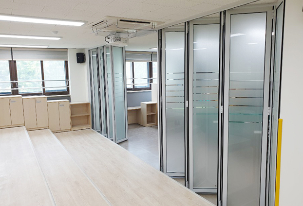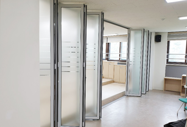 초등학교에 수업이 다양화가 되면서 많은 체험 활동 및 다양한 학습이 진행되고 있습니다. 그러면서 학교내에 다양한 교실 및 공간이 형성되고 있습니다. 이로써 더욱 많은 공간 활용도를 위해 폴딩도어를 설치하여, 넓은 공간도 분리하여, 두 공간으로 사용할수 있도록 하였습니다.