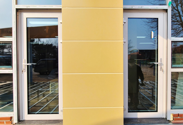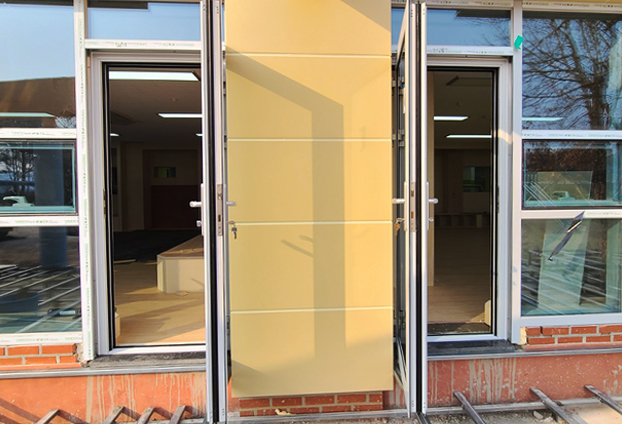 학교외부와 다목적교실이 연결된 출입문 경첩도어 입니다. 외부와 연결된 점에서 더욱 편리하게 다목적교실을 출입할 수 있게 되었습니다.