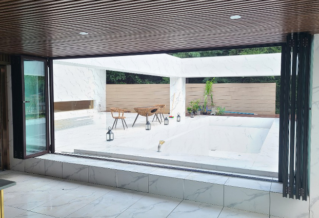 고급진 단독 풀빌라펜션에 너무나 잘 어울리는 폴딩도어의 모습으로 인테리어 역시 더욱 멋지게 업그레이드 시켰으며, 전체적인 펜션의 모습도 고급스러움을 더하였습니다.