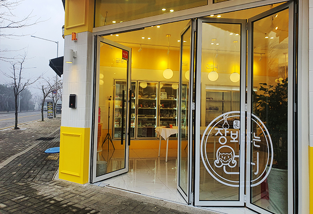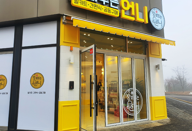 장봐주는언니 운양점에는 총 3장의 접이식 폴딩도어와 1장의 힌지도어가 설치되었습니다. 주 출입문으로는 힌지도어를 사용하며, 물품 입고할 때에는 모두 개방하여 넓은 출입공간을 확보합니다. 폴딩도어의 90% 이상이 개폐되기 때문에 많은 물품과 부피가 큰 물품들도 손쉽게 옮길 수 있습니다.