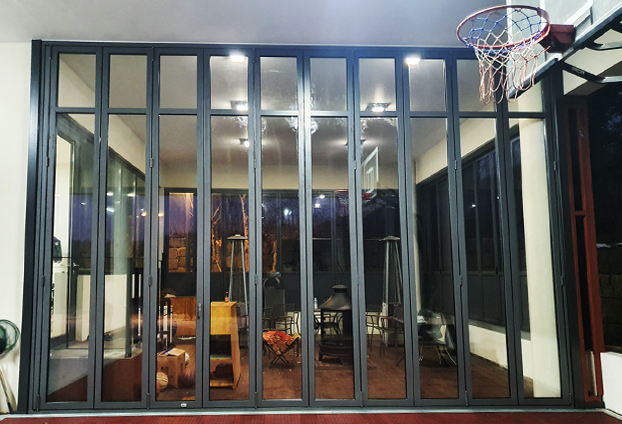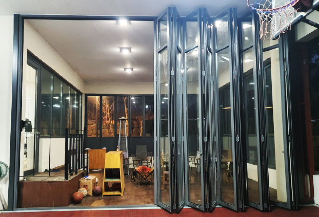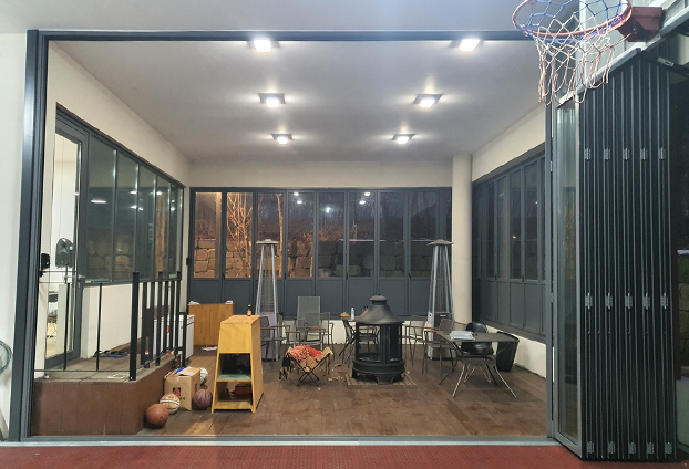 하지만 테라스 공간과 이어진 거실 공간에는 공간이 분리되지 않은체 그대로 오픈형으로 되어있어 공간 분할을 위해 거실과 테라스 공간 중문으로 폴딩도어를 설치하였습니다. 천장이 높게 설계된 주택으로 그에 맞게 폴딩도어 높이가 높아지면서 안전성을 위해 미들바 1개를 추가하였습니다. 추가한 미들바로 안전성 높아지고 폴딩도어의 디자인도 더욱 멋져 인테리어 효과에도 도움을 주었습니다.
