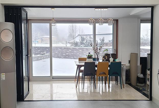 개인 단독주택으로 1층에 위치한 실내 공간이 외부에서 유리창을 통해 노출이 될 수 있는 점에 프라이빗한 공간으로 블라인드가 포함된 폴딩도어를 설치 하였습니다.