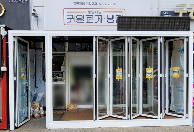 깔끔한 간판의 컨셉과 맞춰 밝고 화사한 화이트 색상의 폴딩도어로 설치가 진행되었으며, 안전성에 뛰어난 모티스락을 장착 한 별도의 출입문으로 상점 내부로 편리하게 출입할 수 있습니다.