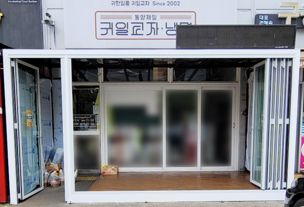 교자만두전문점으로 만두를 찌고 판매할수 있는 공간으로 활용할 수 있는 구조의 상점입니다. 상점 전면에 폴딩도어와 모티스락을 장착한 별도의 출입문을 설치하였습니다.