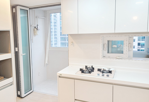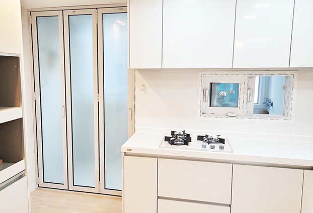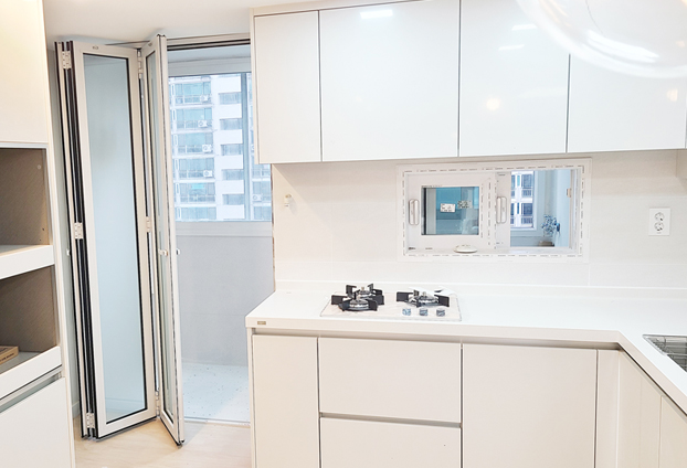 밝고 깨끗한 화이트톤의 부엌 인테리어와 안성맞춤인 화이트 색상의 폴딩도어로 설치하여 이질감 없이 잘 어울리도록 하였습니다.