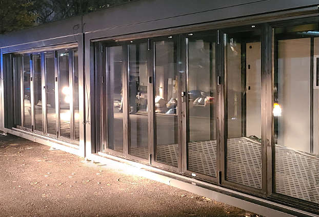 한 부스당 6장의 폴딩도어로 한 방향을 구동이 가능한 편개형전개방식으로 시공을 진행하였습니다. 외부에 설치되는 만큼 오염물에 강한 블랙 색상으로 통일하여 설치를 하여 처음과 같은 색상으로 오랜시간동안 깨끗하게 유지가 가능합니다.