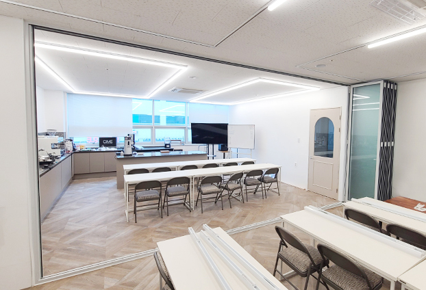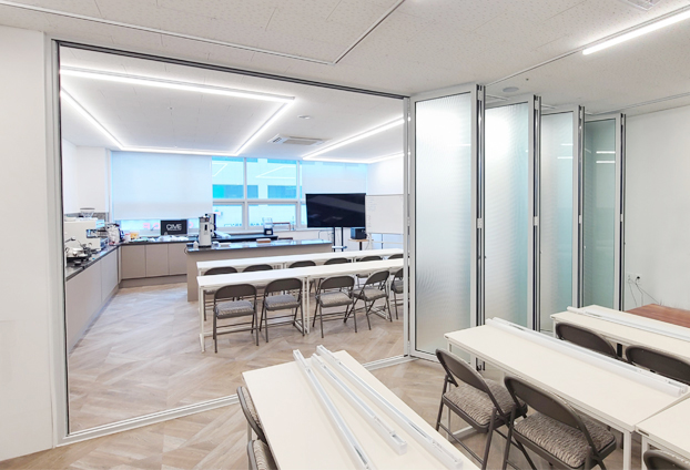 시간마다 수업이 진행되는 커피 바리스타 학원입니다. 수업이 필기와 실기 수업으로 나눠지며, 한 수업에 참여하는 학생 수도 각각 다르기 때문에 지정된 강의실이 비좁을 수도 있으며, 너무 넓을 수도 있습니다. 그리하여 수업 참여하는 학생 수에 따라 공간 확장과 분리를 통해 공간 활용을 하여 수업을 진행할 수 있습니다.