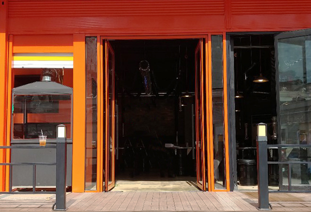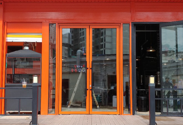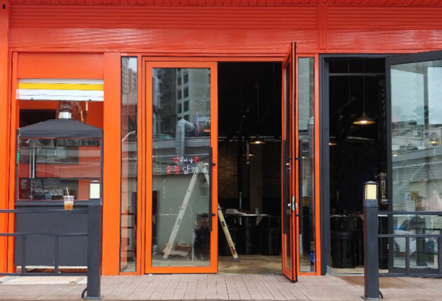 음식점 출입문으로 힌지도어 2개를 설치하여 양문형 출입문을 시공하였습니다. 힌지도어는 사람이 출입할 수 있는 출입문 역할을 하는 도어로써 180° 회전하는 도어이며, 폴딩도어와 호환이 되어 폴딩도어와 출입문 개폐시 전체적인 개폐가 가능한 출입문이며 시건장치가 가능하여 안전성에도 뛰어난 출입문입니다.