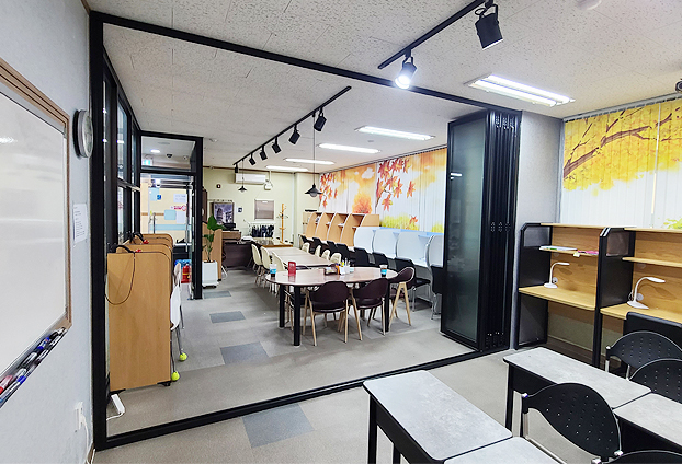학원에 폴딩도어를 시공한 사례 입니다. 학원에 따로 조용하게 공부를 할 수 있는 공간을 마련 하였습니다. 평상시에는 개별 자유 공부를 할수 있도록 하다 수업을 진행을 해야하는 상황에는 폴딩도어로 공간을 분리하여 한쪽은 자유 공부 교실과 수업 교실로 나눠 진행 할 수 있습니다.