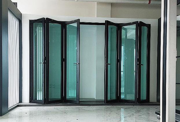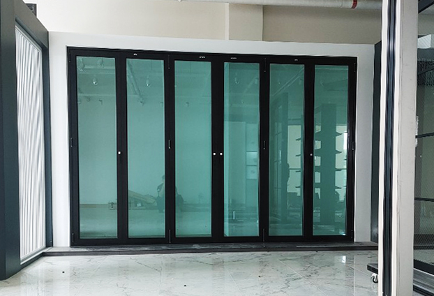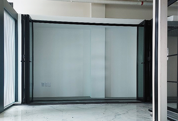 총 6장의 일반형폴딩도어로 전시가 되었으며 그린+그린 색상의 복층 유리로 제작 되었습니다. 양쪽으로 개폐가 가능한 양개형 전개방식으로 진행하였습니다.