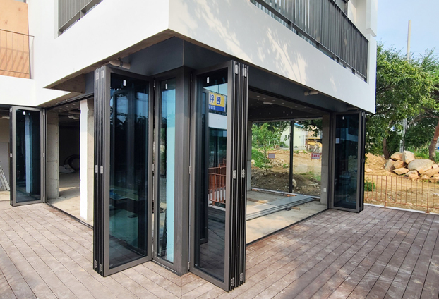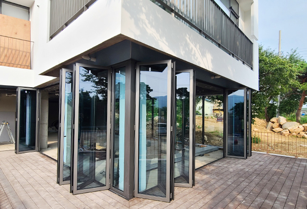 폴딩도어 한 프레임마다 편개형 전개방식으로 시공하였지만 모두 개방하였을때는 양개형 전개방식의 느낌을 줍니다.