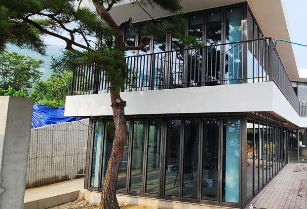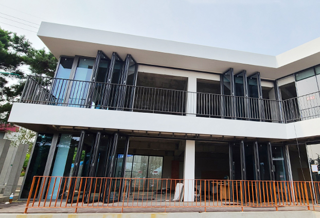강화도에 건축 중인 신축건물입니다. 총 2층인 저층 건물로 상하좌우 모두 폴딩도어와 픽스창으로 모두 시공하였습니다. 모두 폴딩도어를 설치한 탓에 일반적인 건물의 모습이 더욱 멋지게 설계된 건물의 모습으로 탄생하였습니다.