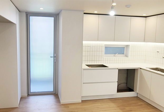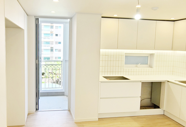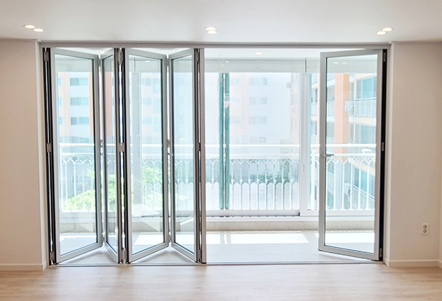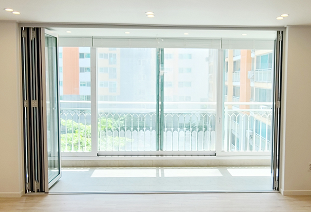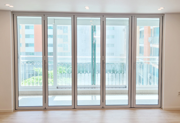 베란다에 설치한 폴딩도어는 총 5짝의 폴딩도어를 설치하였으며, 집안 분위기와 맞게 화이트색상으로 제작하였습니다. 폴딩도어는 닫아두었을 때와 열어두었을 때 모두 장점을 가지고 있는 도어입니다. 닫아두면 방음,단열,방풍 효과가 뛰어나다나는 기능적인 장점과 예쁜 외관으로 인해 인테리어 효과 또한 뛰어납니다.