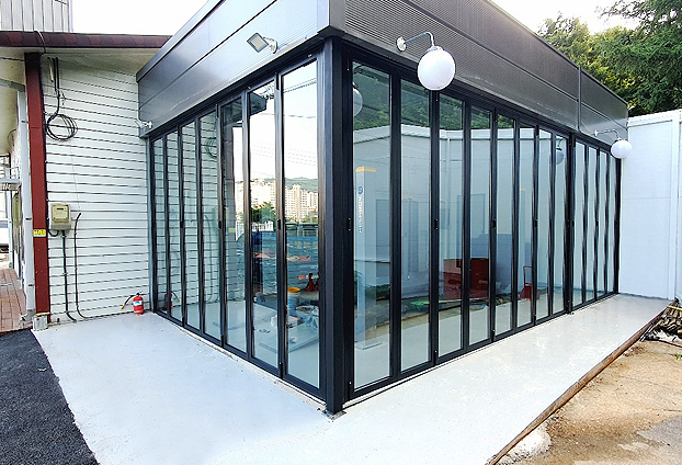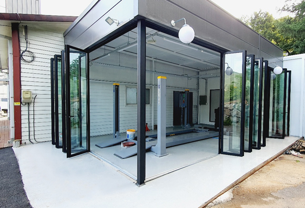 이러한 단점으로 좌우로 여닫을수 있는 폴딩도어를 설치함으로써 필요시에 여닫음이 손쉽게 가능하여, 외부 기온과 날씨의 변화을 차단할 수 있고, 기온에 따라 냉/난방 에너지 손실도 차단하여 비용 역시 절감 효과를 보실수 있습니다. 작업자들께서도 외부와의 차단된 실내에서 작업을 진행 할수 있게 때문에 쾌적한 환경에서 효율적인 작업 속도로 진행이 됩니다.