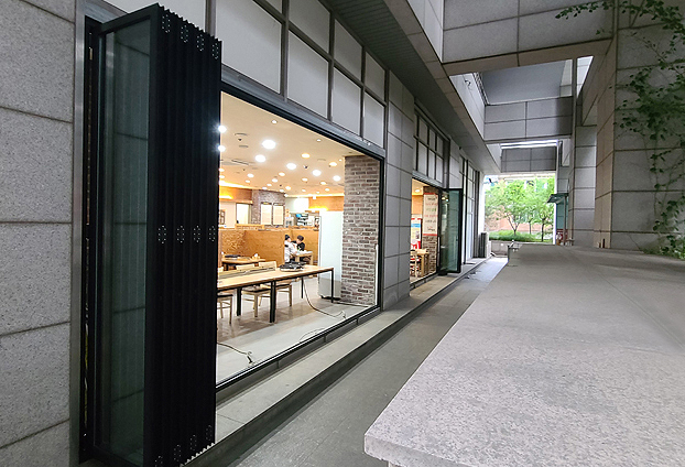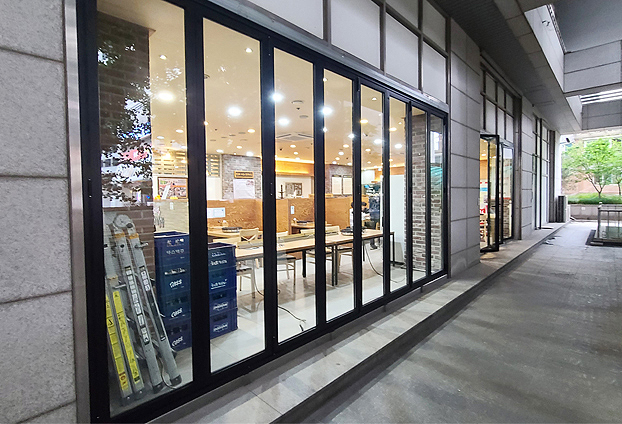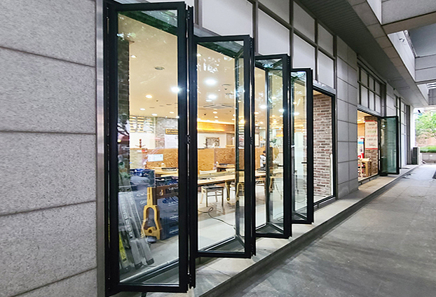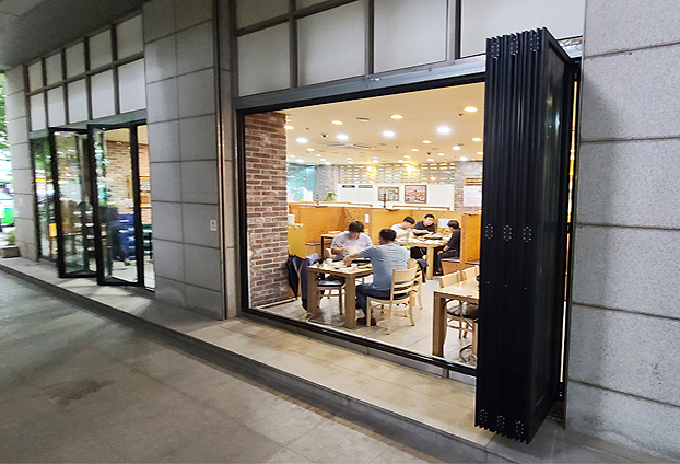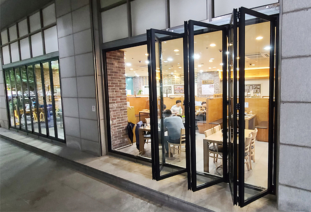 날씨가 좋고, 상점에 많은 손님분들께서 방문하실 시간에는 폴딩도어를 활짝 열어 음식 냄새도 외부로 빠지게 하여 빠른 공기 순환으로 상점 내부의 공기를 쾌적하게 유지할수 있으며, 날씨가 추운 겨울날에는 틈틈히 폴딩도어를 개방하여, 빠른 환기로 조리시 나는 열기로 생기는 유리창에 생기는 수증기를 없앨수 있습니다.