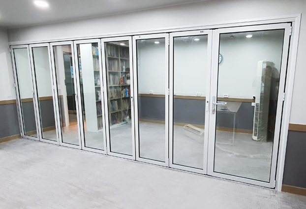 폴딩도어의 여러 많은 특징 중 학원, 학교 등에 폴딩도어를 설치하는 이유는 공간 활용도를 높이기 위함이 큽니다. 도어를 닫아 넓은 공간을 분리하여 사용하기도 하며, 도어를 접어 한공간으로 확장하여 사용도 가능합니다. 실내 공간을 분할 해 사용할수 있는 공간 효율성에 우수한 폴딩도어 입니다.