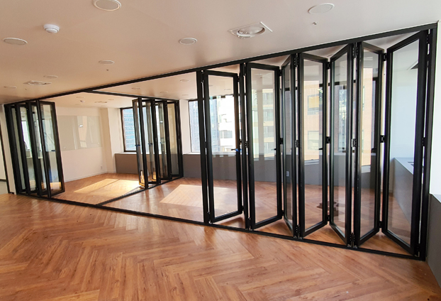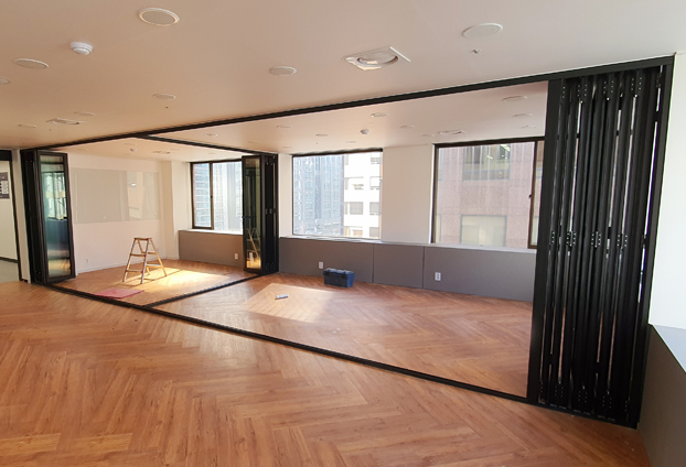 넓은 한공간으로 된 층에 회사 사무실이 곧 입주 할 예정입니다. 그리하여 공간을 나누기 위한 목적으로 폴딩도어를 설치하였습니다. 폴딩도어를 설치하여 공간을 나누기도 확장하기도 하여 여러 목적으로 다양하게 사용이 됩니다.