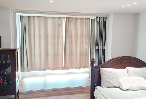 은은한 커텐과 함께 화이트색상의 프레임 폴딩도어가 조화롭게 어울려 더욱 방안 인테리어가 세련되고 고급스러워졌습니다. 알루미늄(AL-6N01) 고합금 재질과 베어링 롤러 형태로 레일을 타고 주행시 부드럽게 개폐 할 수 있도록 설계 되었으며 런너가 이탈을 하지 않도록 안전하게 설계되어 방안에서도 안전하고, 반자동 구동방식으로 손쉽게 열고 닫음이 가능합니다.