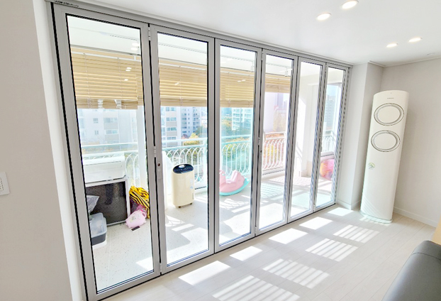 90% 이상의 개폐율를 자랑하는 폴딩도어로 필요에 맞게 여닫아 공간활용도를 높게 합니다. 샷시 틀 위에 하부레일을 끼워 시공을 하였어도, 하부레일이 더 높아지는 것이 아니라 기존 그대로의 틀 높이를 유지하여 통행에 불편함을 주지 않습니다. 넓은 확장감에 넓은 거실의 공간도 생기지만 빠른 공기 순환으로 쾌적한 실내공기를 유지할수 있습니다.