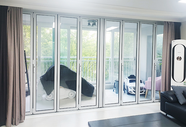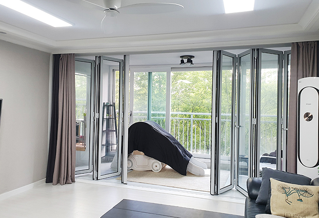 일반적으로 베란다와 거실 중문으로 문의 한면이 고정되어 있고, 고정되지 않은 쪾을 밀거나 당겨서 여닫는 프로젝트창으로 되어있습니다. 이런경우 아무래도 고정되어있는 큰 유리로 출입공간에 한정 되어있기에 큰 물건 등을 옮긴다거나 베란다 공간활용이 다양해지는 요즘 프로젝트창으로만은 베란다 공간 꾸미기 등 활용도가 떨어져 개폐율이 좋은 폴딩도어 설치를 많은 분들이 선호 하십니다.