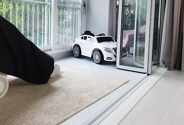 입주 전 전체 인테리어 시공과 함께 설치된 경우가 아닌 이미 거주하시다 프로젝트창을 철거하고 폴딩도어로 교체 시공한 경우입니다. 이미 가구,전자기기 등이 위치하고 있는지라 전체 인테리어 시공과 같은 방식의 시공은 진행하기에는 철거비용이 추가되며 인테리어에 손상이 될수 있습니다. 그렇기에 기존 샷시틀을 철거하지 않고, 프로젝트창만 철거 하는 방식으로 무철거 하부레일 시공방식을 진행합니다.
