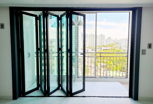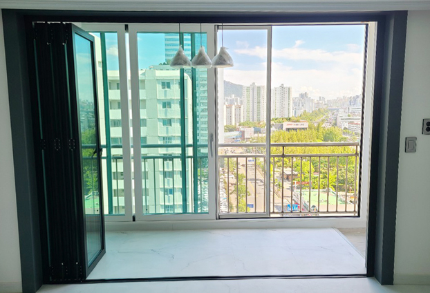 폴딩도어를 설치 후 모두 펼쳐 베란다와 거실 중문으로 공간을 분리하여, 베란다와 거실 공간 구성에 맞게 생활을 할수 있습니다. 햇빛이 가장 잘 들어오는 베란다로써 햇빛에 노출이 되는 곳의 프레임 도장이 빛에 바래지거나 벗겨짐이 생길까 하는 걱정을 하시는 분들이 간혹 계시곤 합니다. 분체 도장방식이 아닌 불소수지 도장방식으로 프레임 도장을 진행하기에 프레임 색상의 내구성 및 변색 / 벗겨짐 현상을 최소화 시켰습니다. 오랜기간 사용하여도 프레임의 도장 A/S의 발생률이 현저하게 적습니다.