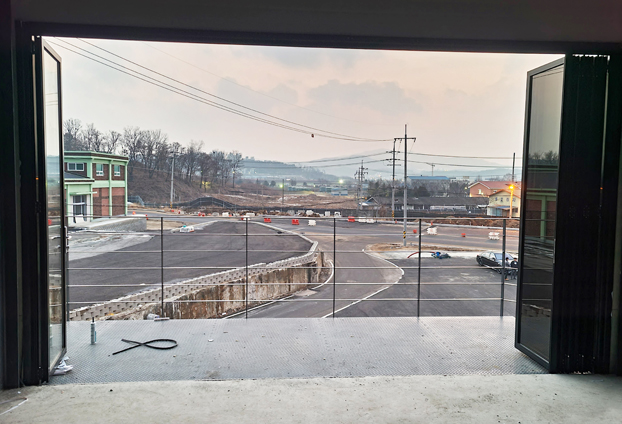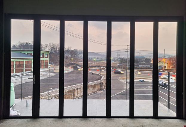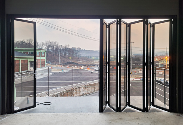 외부에서 들여오는 많은 양의 자재 또는 물품을 고층인 실내 안으로 옮길때 좀더 수월하고, 편리하게 진행할수 있도록 폴딩도어로를 설치하여 더욱 창문 겸 더욱 넓은 출입구로 사용할 예정입니다. 많은 양의 자재 또는 크기가 큰 물품을 엘레베이터, 계단 등으로 사람이 직접 옮길수 없기에 그럴때 지게차 등을 이용하여 대량으로 옮기는 경우에는 창문을 통해 손쉽게 옮길수 있는데, 그럴때 일반 미서기(미세기)창 이라면 고정되어 있는 부분이 있기 때문에 넓은 출입구를 보유하지 못하거나, 아니면 창문을 때서 옮기고 다시 키워야하는 불편함과 번거로움이 생길수 있는데, 창문형 폴딩도어는 미서기(미세기)창에서 느낄수 있는 단점들을 보완 할수 있습니다.