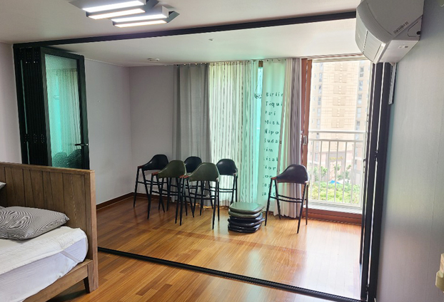 총 6개의 폴딩도어로 5개와 1개로 나누어 양개형 구동방식으로 진행하였습니다. 유리는 많은 유리종류 중 아쿠아 유리로 선택하여 반투명유리의 효과로 사생활보호를 할수 있도록 하였습니다. 사진에서 보여지는거와 같이 5개는 펼쳐 공간 구분을 한 후 1개의 폴딩도어를 이용하여 출입문으로 사용이 가능하도록 하였습니다. 또한 양쪽으로 모두 접어 넓은 공간으로 확장도 가능합니다.
