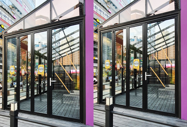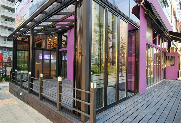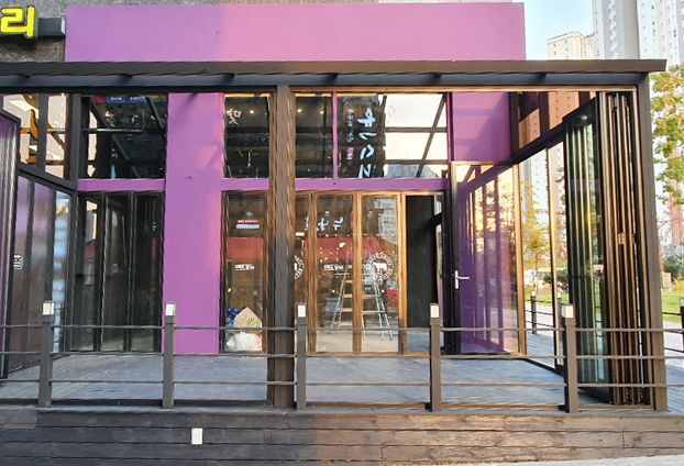 이 상점은 앞부분과 옆부분에 발코니가 있는 곳 입니다. 의뢰하신 고객님께서는 발코니의 활용도를 더욱 높이기 위해 외부 폴딩도어 시공을 선택하셨습니다. 많은 장점을 갖춘 폴딩도어는 점점 개발되고 상용화 되면서 카페테라스, 상가 외벽 등 다양한 공간에 많이 시공되어 사용되고 있습니다. 이렇게 테라스가 있는 곳은 더욱더 폴딩도어를 이용하여 더욱 넓은 평수의 상점으로 테라스를 사용할수 있습니다.