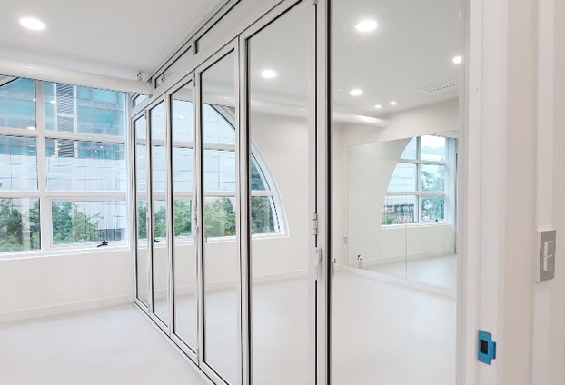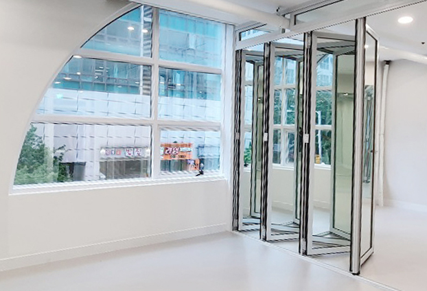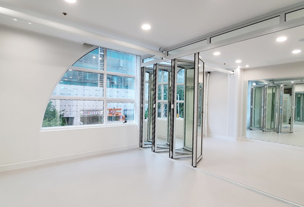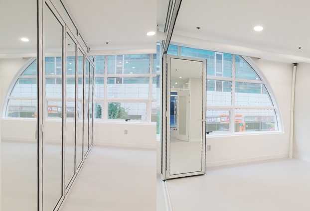 필라테스 및 요가, 휘트니스센터 등 운동샵에서는 운동하는 자세 등을 확인하며 진행하게 됩니다. 그래서 여러곳에 거울을 설치하곤 합니다. 폴딩도어의 투명유리창 대신 은경(거울)을 넣어 시공을 하였습니다. 거울로 인해 운동하는 자세도 확인이 가능하지만, 투명하지 않는 창으로 공간 구분을 확실히 하여 운동 진행에 더욱 집중을 할수 있습니다. 또한 일반 답답한 불투명이 아닌 거울로 구분한 공간이 비춰지기에 더욱 넓어보이는 효과도 줄수 있습니다.