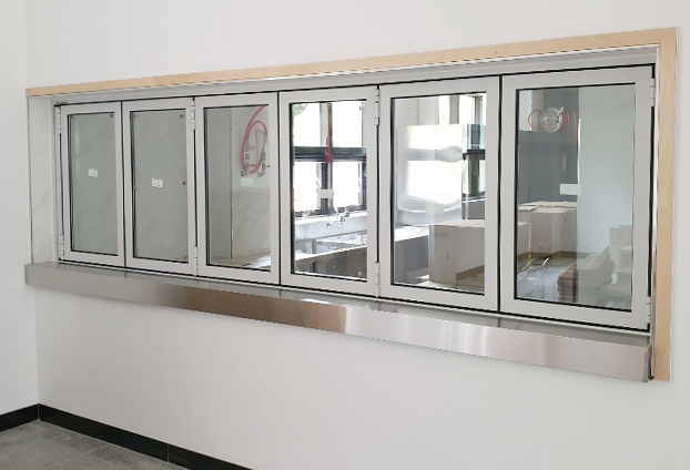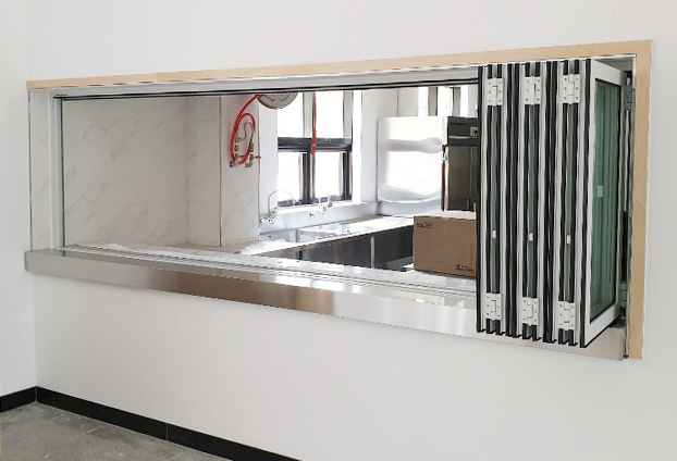 성당 안에 자리한 식당 내부에 주방과 식사 자리를 연결해주는 곳에 창문형 폴딩도어를 설치하였습니다. 식사시간에는 창문형 폴딩도어를 열어 준비된 음식을 식사 할 수 있게 전달 하며, 식사시간이 끝난 후에는 창문형 폴딩도어를 닫아 식사공간과 주방공간을 분리 하였습니다.