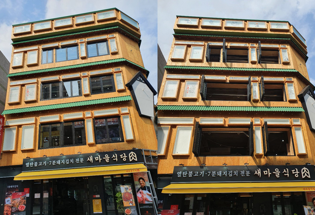 상가 2~4층까지 생기는 규모가 큰 호프집 창문을 모두 폴딩도어로 시공 하였습니다. 독특한 외관의 상가로써 폴딩도어 시공까지 완료 하니 더욱 멋진 상가로 완성 된 느낌입니다. 화려한 모습의 상가 모습에 이질감 느끼지 않도록 블랙 색상의 프레임으로 진행하였으며 양쪽으로 여닫을수 있는 양개형 전개방식으로 시공을 진행하였습니다.
