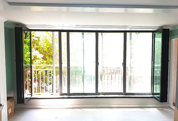 많은 아파트(주거지)에서 제일 많이 시공하는 장소 1순위로 베란다와 거실 중문으로 베란다 폴딩도어를 시공하십니다. 이는 확장과 비확장의 선택 사항 중 2가지의 장점을 모두 사용할수 있기때문입니다. 이번 시공장소인 아파트는 이미 베란다 확장 공사를 하여 생활 하고 계셨습니다. 확장된 거실공간으로 공간적인 부분은 만족스럽지만, 외부 샷시 하나로만 실내 온도를 유지하기가 힘들며, 특히 여름과 겨울에 많은 냉난방비로 폴딩도어를 베란다 샷시와 함께 2중창으로 시공을 진행하였습니다.