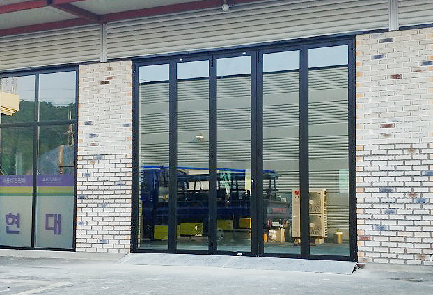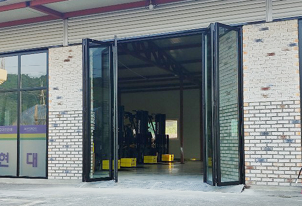 그린+투명 복층유리로 일단 투명유리창보다 좀더 고급스럽고 세련되며 깔끔한 폴딩도어의 모습으로 시공이 되었습니다. 총 5개의 문짝으로 양쪽 방향으로 여닫이를 할수 있는 양개형 구동방식으로 진행 하였습니다. 양개형 구동방식으로 필요시에 따라 넓은 출입구 또는 한쪽만 열어 출입문 공간을 조절 할수 있습니다.