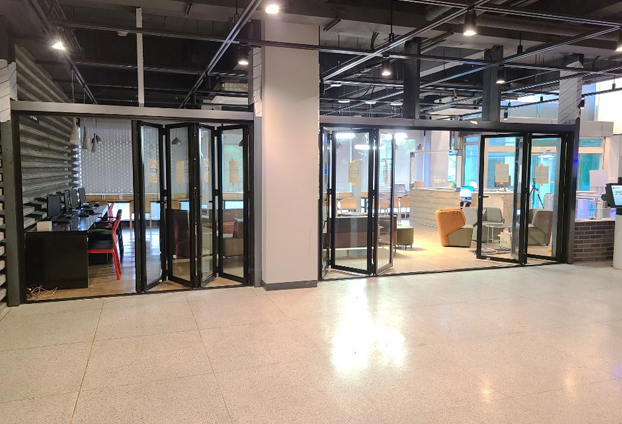 대학교 중앙도서관 내부에 휴게실 출입문으로 폴딩도어를 설치하였습니다. 2곳으로 나눠 4짝 + 6짝 총 10짝으로 투명+투명 16t 복층유리로 시공을 진행하였습니다. 많은 학생들과 외부 방문객께서 담소 또는 휴식을 할수 있는 공간 입니다. 많은 분들께서 방문하시기에 그만큼 생활오염이 많이 생길수 있는데요. 생활오염에 강한 블랙색상 프레임으로 오랜 기간 사용하여도 처음과 같이 깔끔한 폴딩도어를 사용하실수 있습닏나.