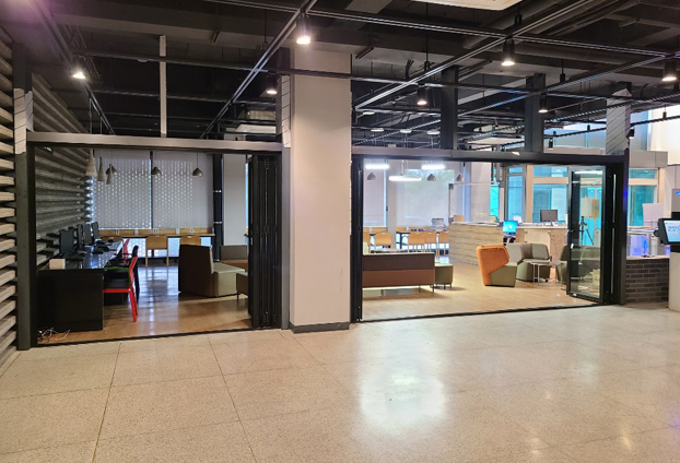 편개형과 양개형 구동방식 모두 적용하여 여닫이가 가능합니다. 폴딩도어를 닫아 공간을 구분하여 휴게실만의 공간을 독립적으로 사용할수 있습니다. 또한 폴딩도어를 열어 공간을 확장하여, 시원하게 트인 넓은 공간으로 사용할수 있습니다.